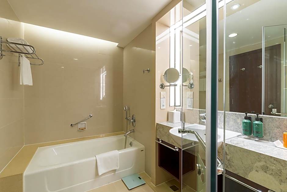 Spacious room features views of Dalian city. It will offer an indulgent bed with cotton linens. The private bathroom comes with a bathtub and branded bathroom amenities.