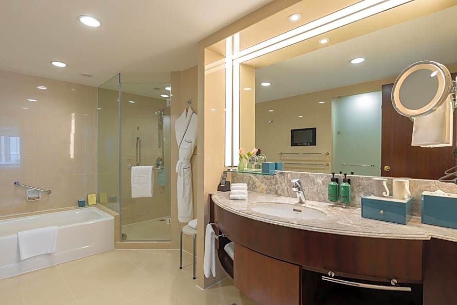With panoramic city or garden views, this suite offers space, comfort and a full array of luxurious amenities. It has a separate living area and a flat-screen TV with satellite channels. Soft bathrobes and extra large towels can be found in the large modern bathroom.